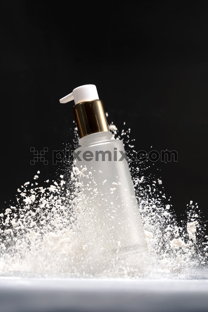Luxury skincare bottle splashing into powder with dramatic effect on black background for beauty branding stock image.