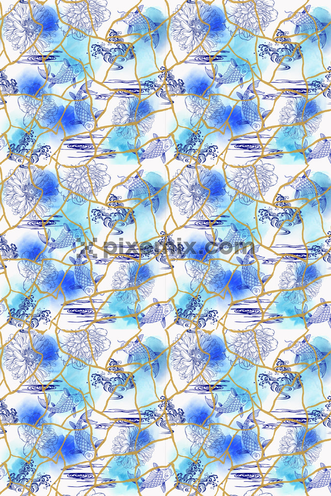 Produktgrafiken mit Koi-Fischen und Blumen sowie nahtloses Wiederholungsmuster