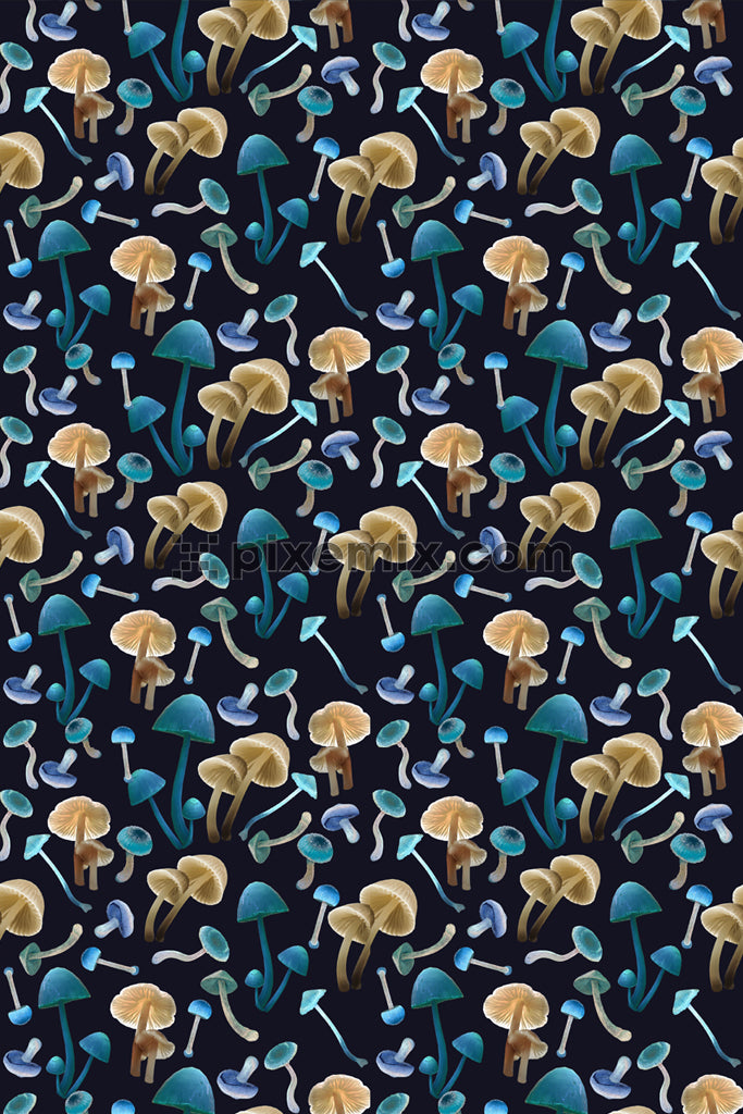 Trendige Produktgrafik mit Neonpilzen und nahtlosem Wiederholungsmuster