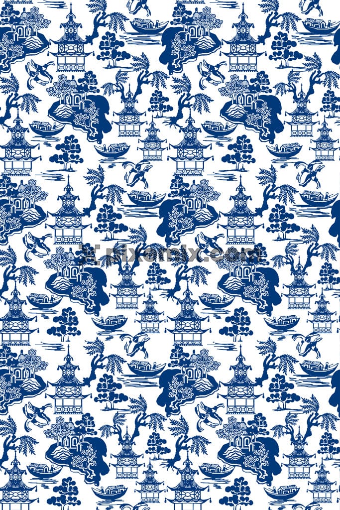 Von orientalischer Kunst inspirierte Produktgrafik mit Bäumen und Vögeln und nahtlosem Wiederholungsmuster