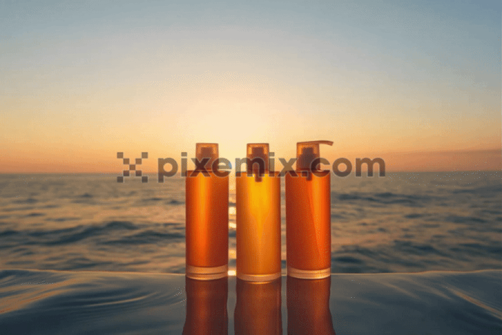 Drei Kosmetik-Sprühflaschen stehen an einem Sandstrand, während die Meereswellen anrollen, und erzeugen so eine erfrischende und heitere Ästhetik. Stockvideo
