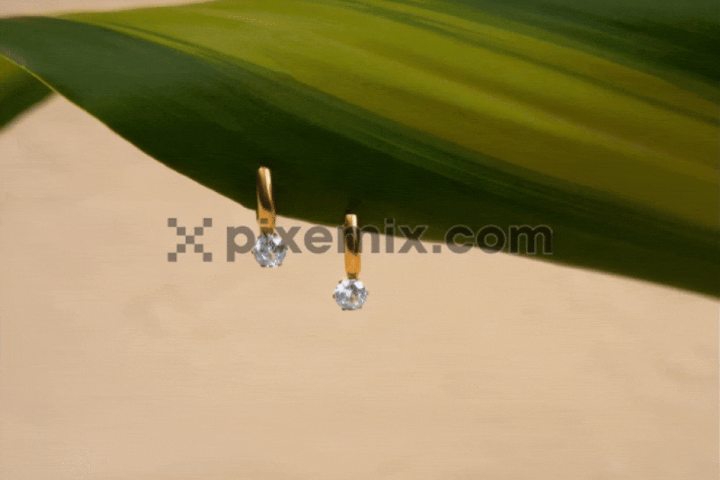 Ein Paar goldene Ohrringe, die zart an einem Blatt hängen. Stockvideo.