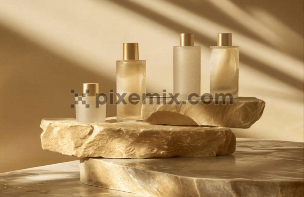 Stockvideo: Drei Glasflaschen, elegant auf einem Felsen platziert.