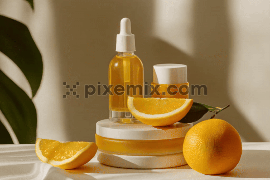 Eine kosmetische Tropfflasche neben einem frischen Orangen-Stockvideo.