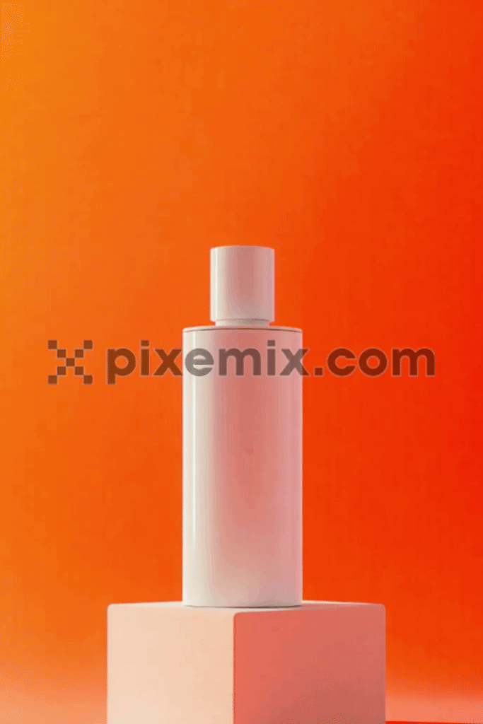 Stockvideo: Eine weiße Kosmetikflasche, elegant platziert auf einem geometrischen Sockel vor einem kräftigen orangefarbenen Hintergrund mit Farbverlauf.