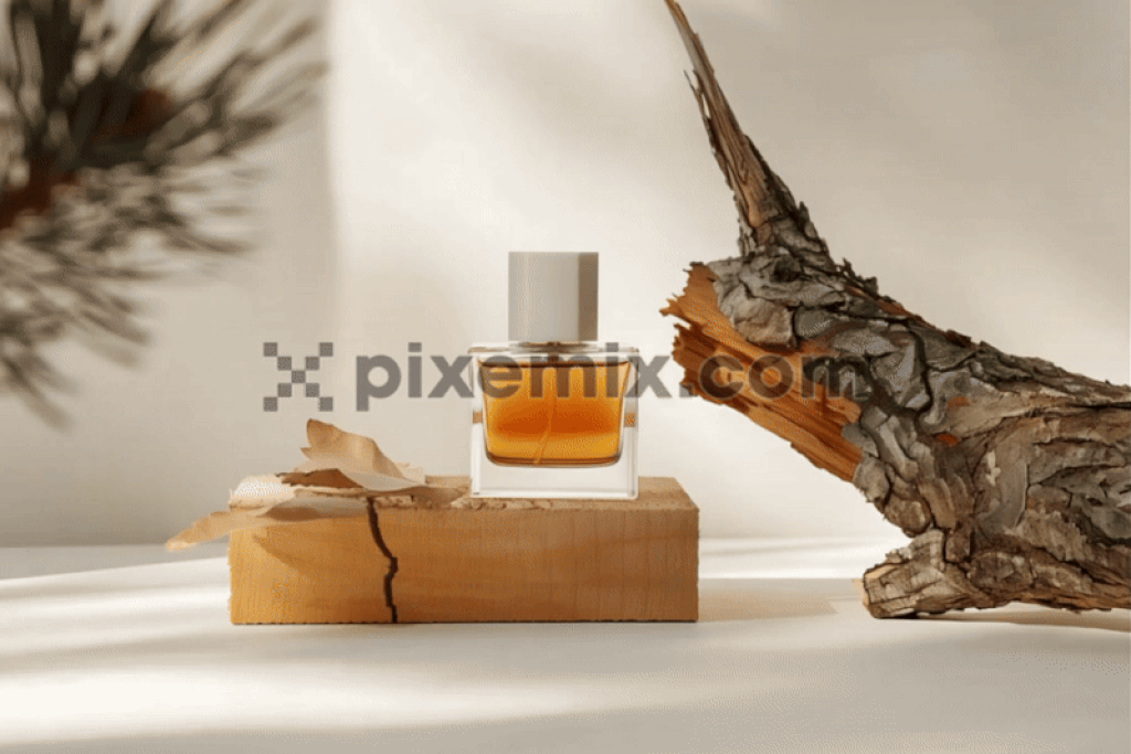Ein Parfümflakon aus Glas mit bernsteinfarbenem Duft, elegant auf einem rustikalen Holzblock platziert. Stockvideo.