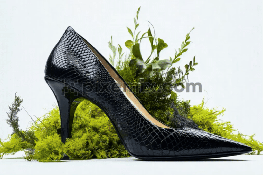 Ein schwarzer High Heels-Schuh mit Schlangenhautstruktur, elegant vor einem üppigen grünen botanischen Hintergrund platziert. Stockvideo.