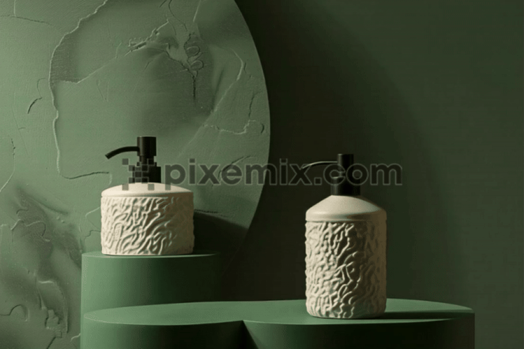 Stock-Video: Zwei elegant gestaltete strukturierte Kosmetikpumpflaschen vor einem tiefgrünen, skulpturalen Hintergrund.