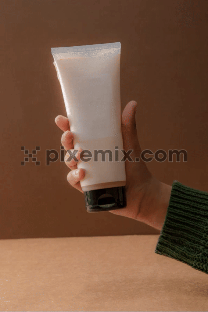Stockvideo einer Hand, die eine elegante, minimalistische Kosmetiktube vor einem warm getönten Hintergrund hält.