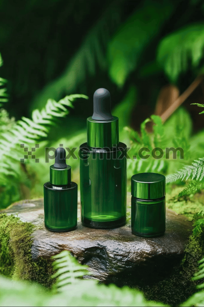 Ein Satz eleganter Tropfflaschen aus grünem Glas auf einem moosbedeckten Felsen, umgeben von üppigen Farnen in einer Waldkulisse. Stockvideo.