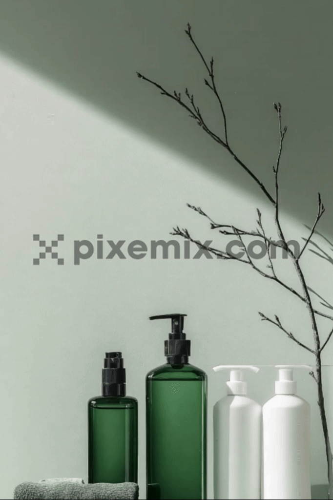 Ein wunderschön zusammengestelltes Arrangement aus eleganten grünen und weißen Kosmetikflaschen vor einem gedämpften grünen Hintergrund mit sanfter, natürlicher Beleuchtung. Stockvideo.