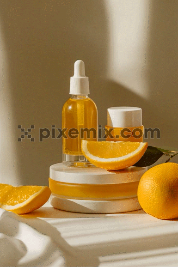 Rosafarbene Kosmetikproduktflasche in einer verträumten, ätherischen Umgebung, gefüllt mit sanften Rosa- und Blautönen und durchscheinenden Blasen.