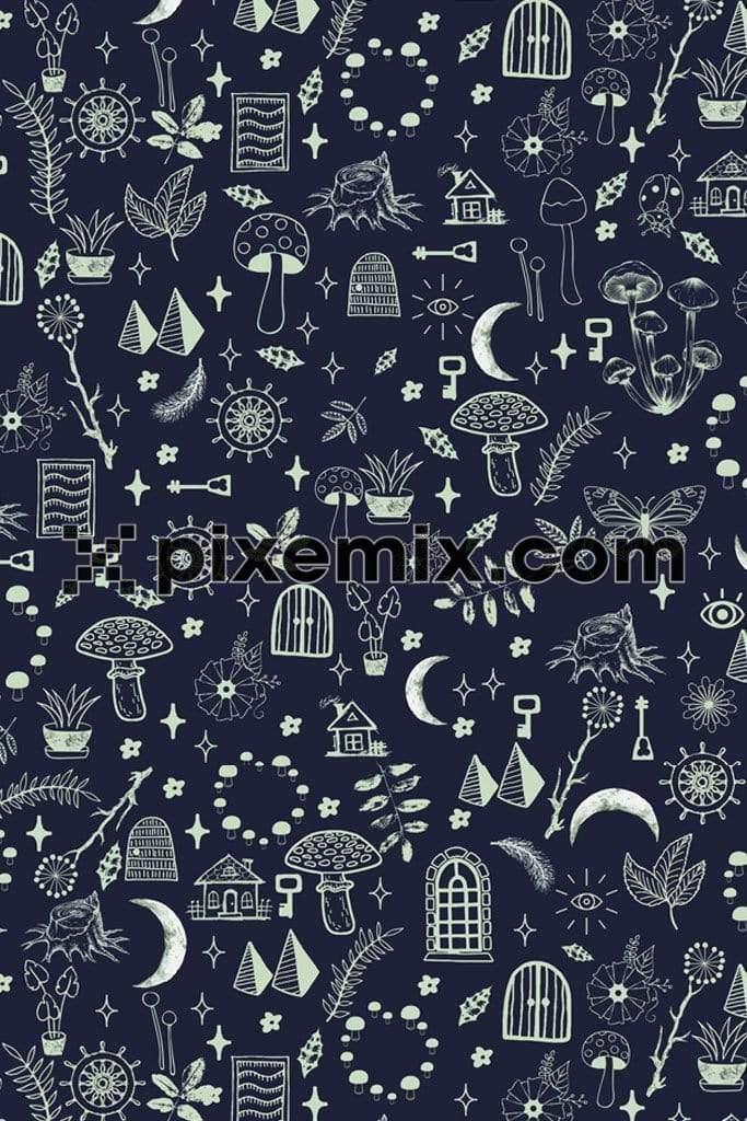 Produktgrafiken mit Pilzen und Blättern und nahtlosem Wiederholungsmuster