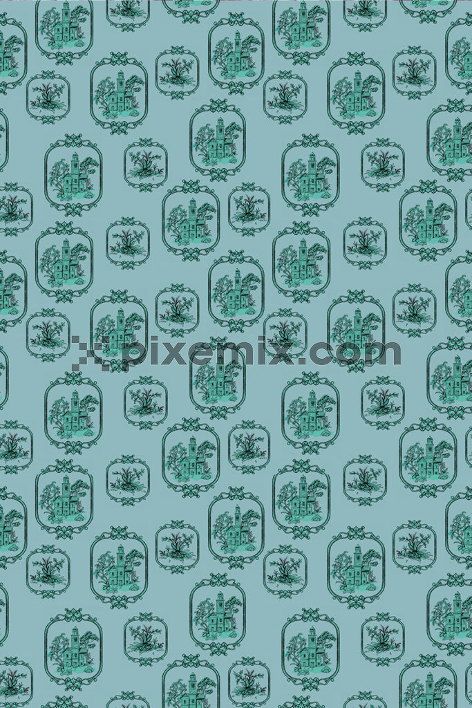 Vintage castle and landscape toile pattern in teal on a classic seamless decorative background.