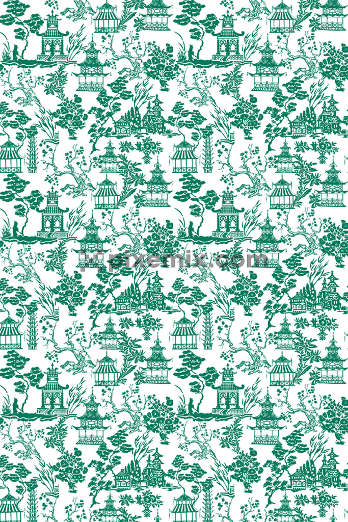 Von Doodle Art inspirierte Vintage-Produktgrafik eines chinesischen Dorfs mit nahtlosem Wiederholungsmuster