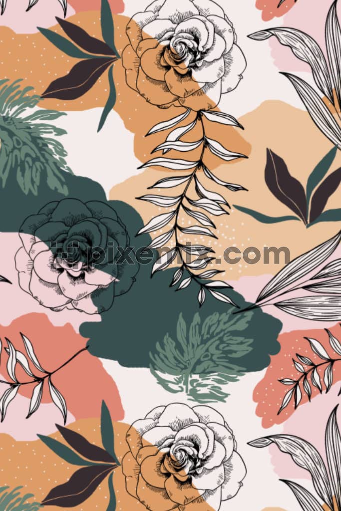 A hand drawn illustration of flowers and leaves with a pastel background in a seamless repeating pattern