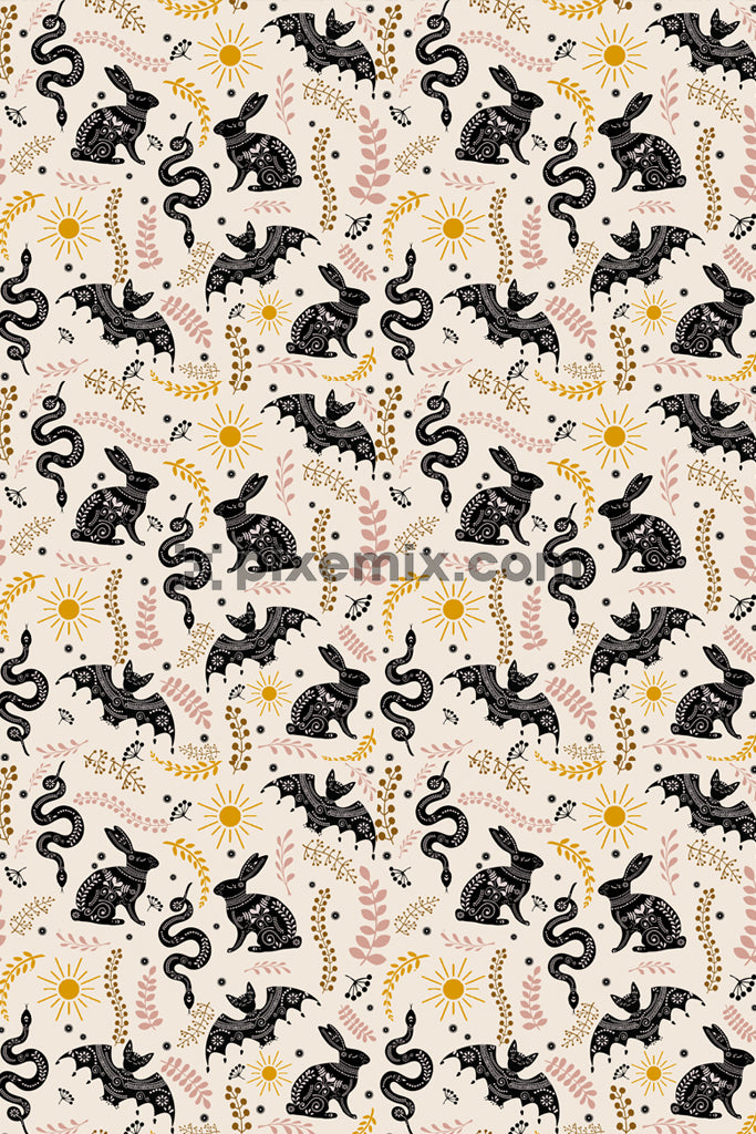 Rabbits, snakes and bats surrounded with leaves product graphic seamless repeat pattern