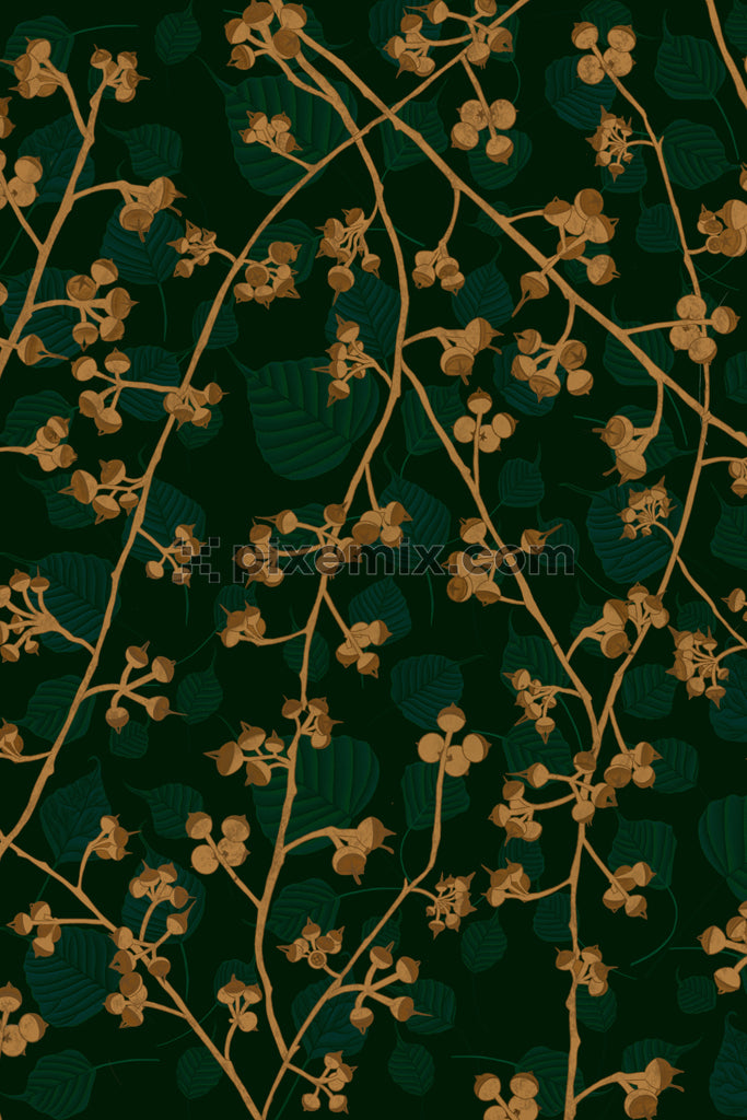 Monochrome banyan leaves & seeds product graphic with seamless repeat pattern