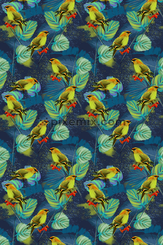 Bird & leave brushed strokes product graphic with seamless repeat pattern
