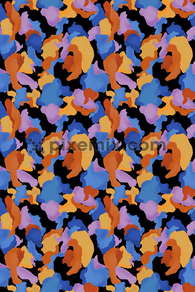 Vibrant abstract camouflage pattern in orange, blue, purple, and yellow on black background.