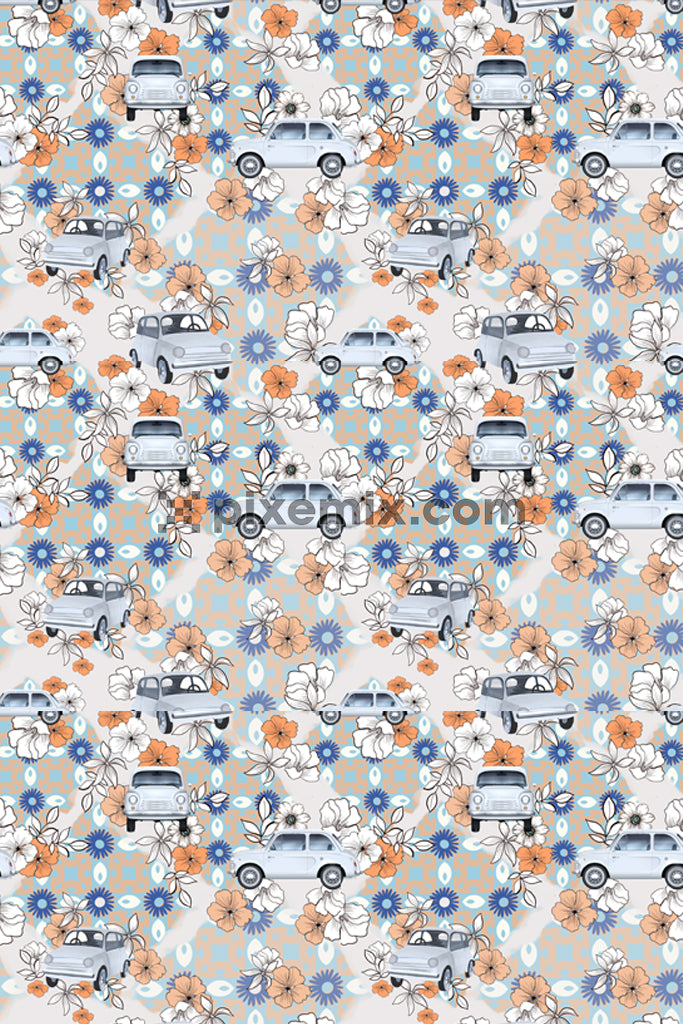 Cars surrounded with leaves and flowers product graphic with seamless repeat pattern
