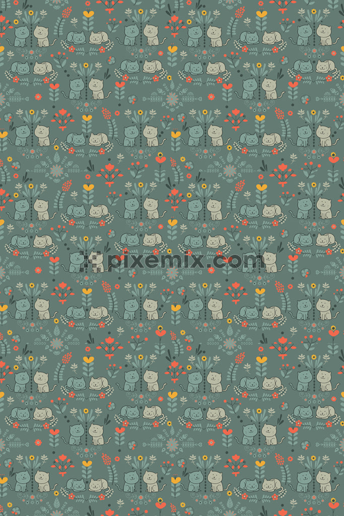 Cat and floral product graphics with seamless repeat pattern