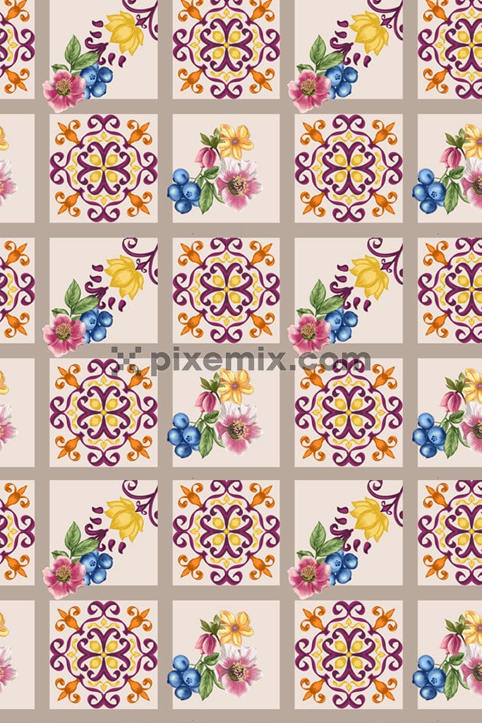 Hand-drawn florals and damask art product graphic with seamless repeat pattern.