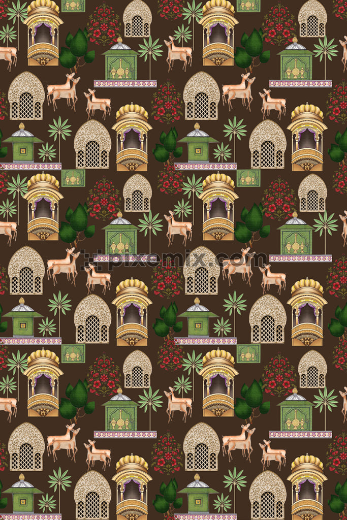 Mughal art inspired dear and florals product graphic with seamless repeat pattern