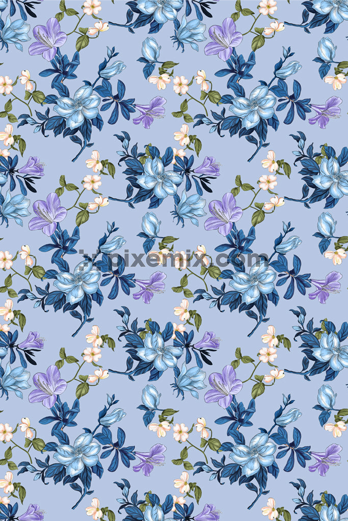 Seamless floral pattern with elegant blue and purple flowers on a soft pastel blue background.