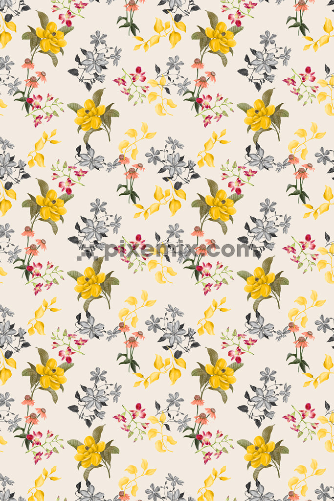 Elegant floral pattern featuring yellow, pink, and grayscale flowers on a soft cream background.
