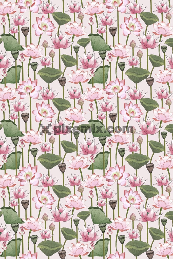 Loutus and leaves product graphic with seamless repeat pattern