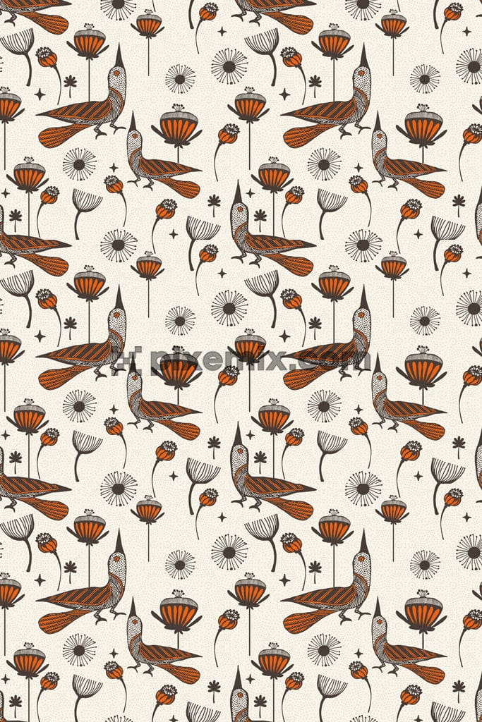 Vector birds arount florals product graphic with seamless repeat pattern