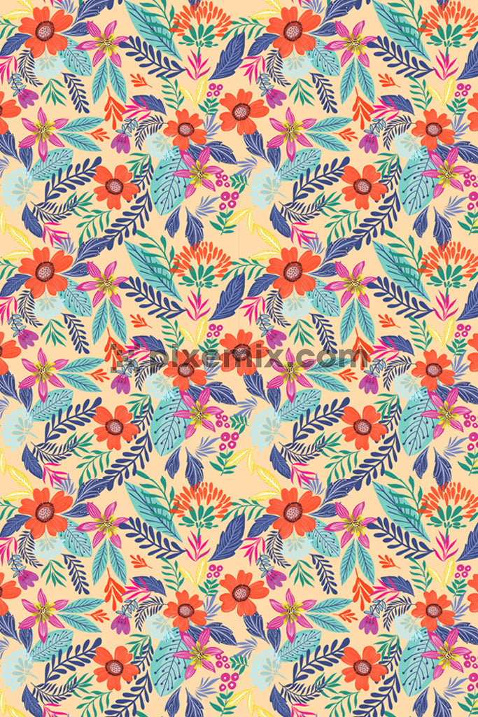 Doodle art florals and leaves product graphic with seamless repeat pattern