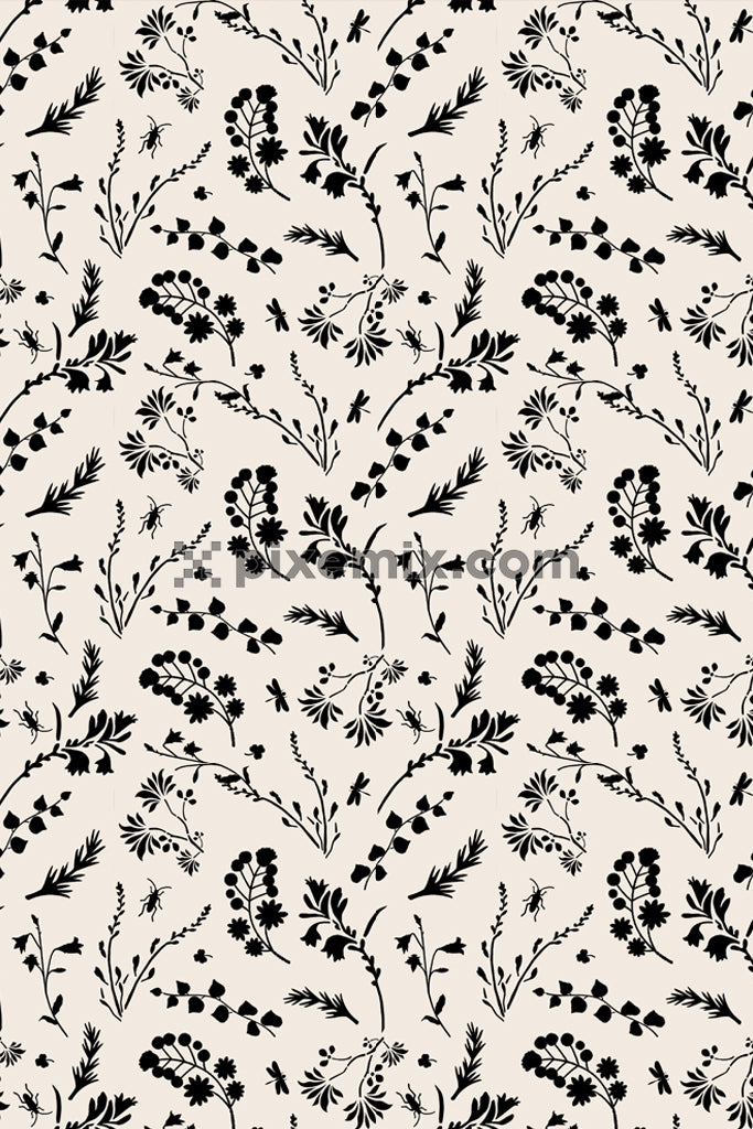 Monochrome florals and leaf product graphic with seamless repeat pattern