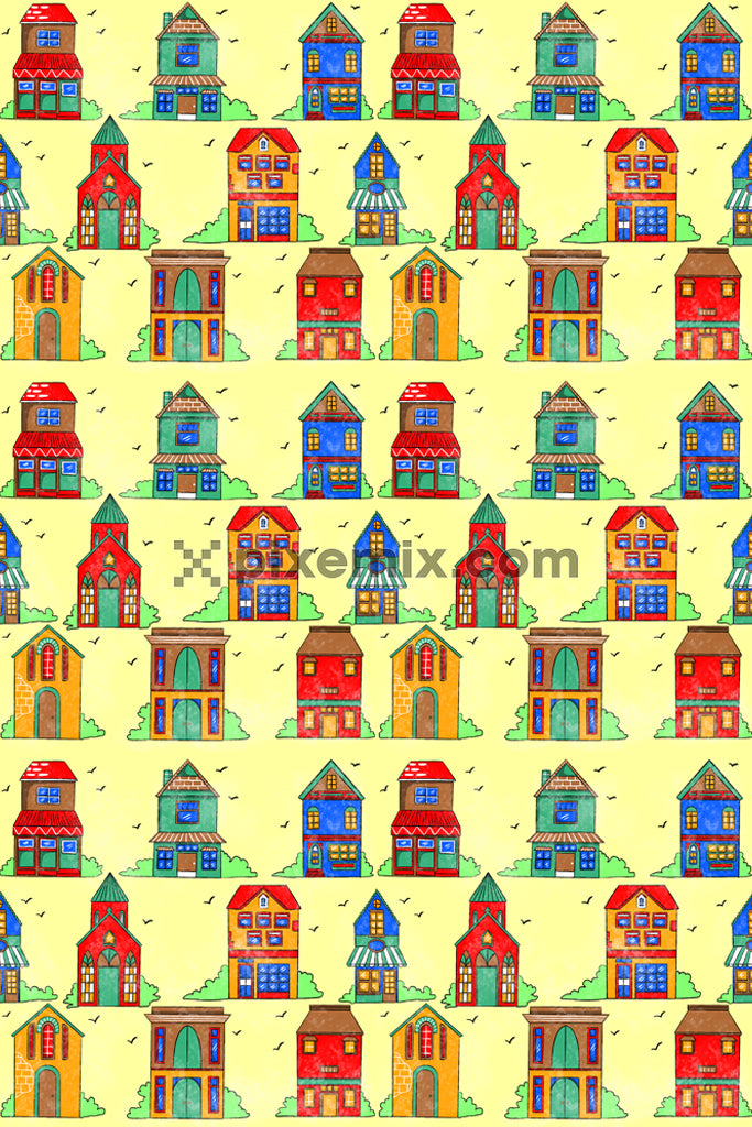 Doodle houses product graphic with seamless repeat pattern