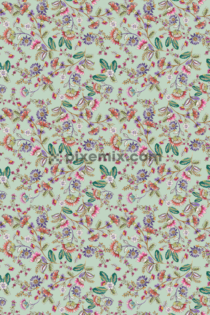 Ethnic water color intricate floral product graphic with seamless repeat pattern