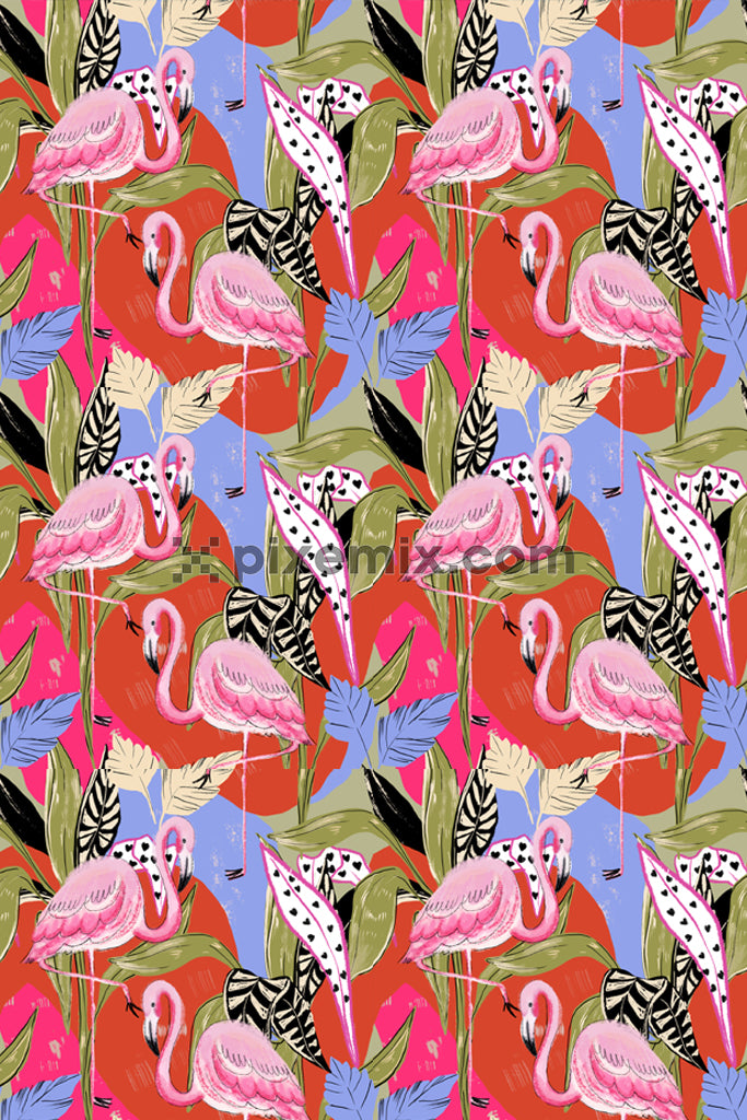Pink flamingo and tropical leaves product graphic with seamless repeat pattern