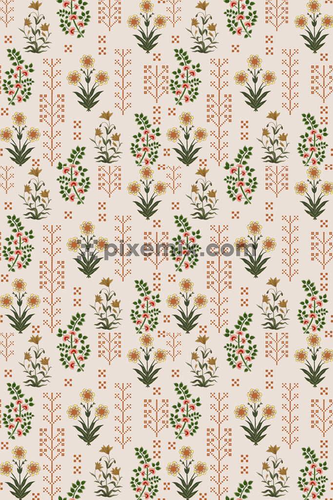 Mughal art inspired florals and leaves product graphic with seamless repeat pattern