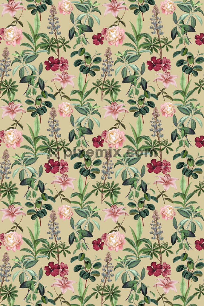 Tropical leaves and florals product graphic with seamless repeat pattern