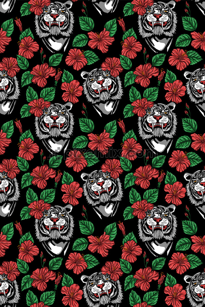 Jungle art inspired hibiscus florals and tiger face product graphic with seamless repeat pattern