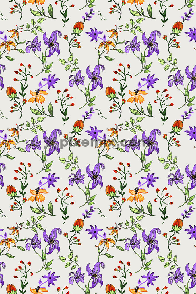 Hand-drawn florals and leaves product graphic with seamless repeat pattern.