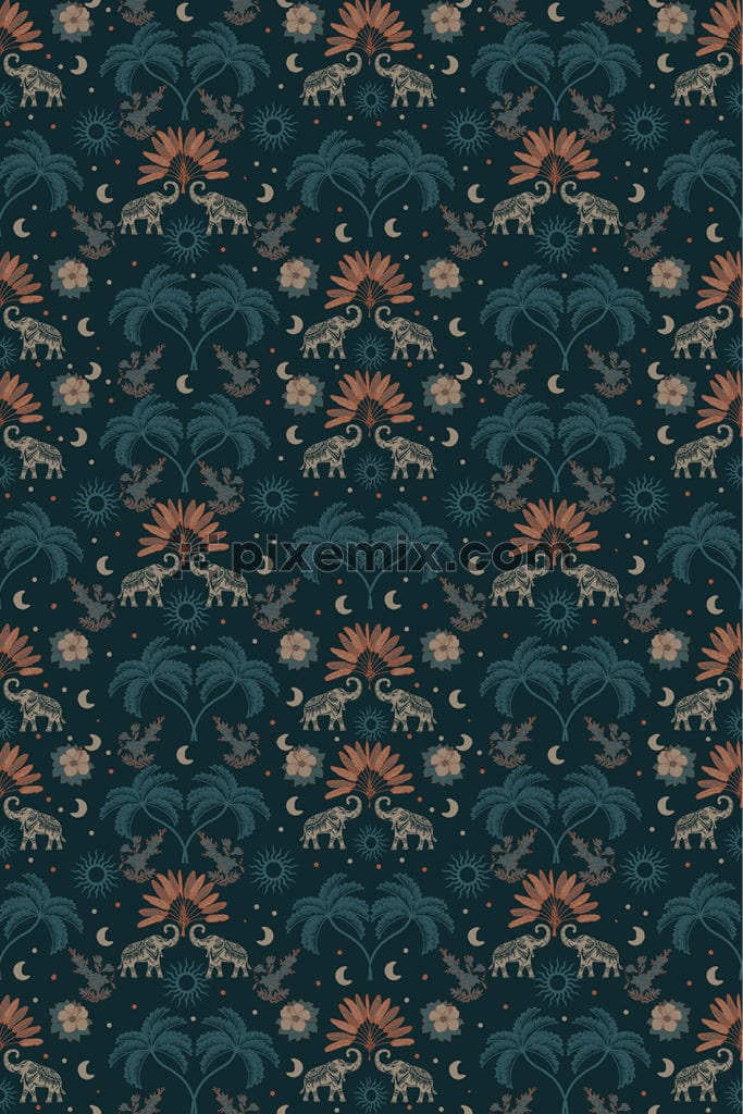 A hand drawn floral illustration of digital flowers and berries with a seamless repeating pattern.