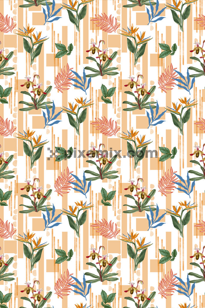 A tropical floral pattern featuring exotic flowers and geometric accents.