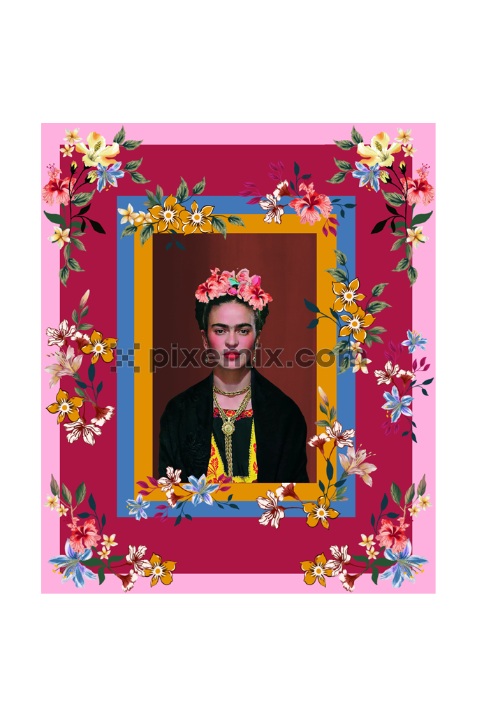 Frida kahlo portrait with rectangular floral photo frame product graphic