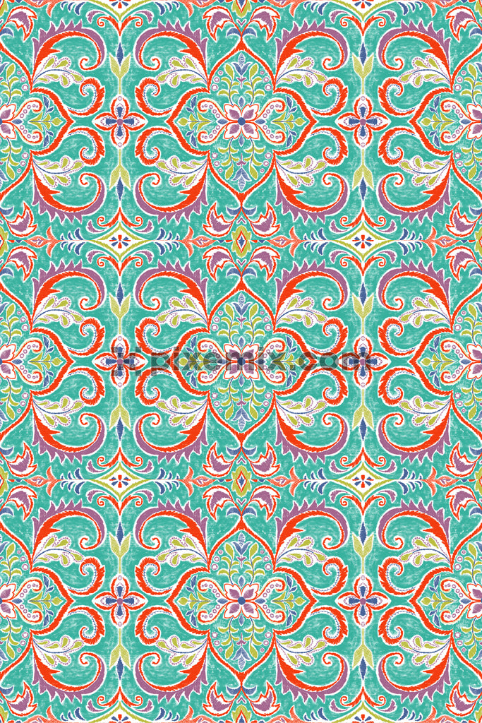 Vibrant ikat floral on watercolor background product graphic with a seamless repeat pattern.