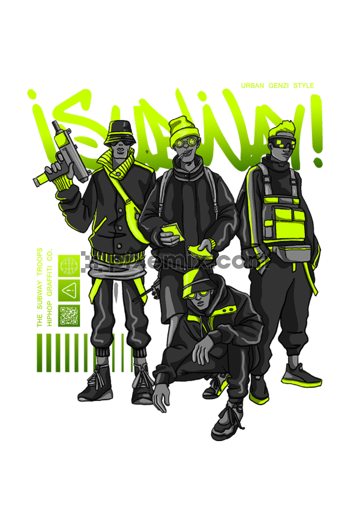 An illustration depicting a gang scene set against a deep black background product graphic.