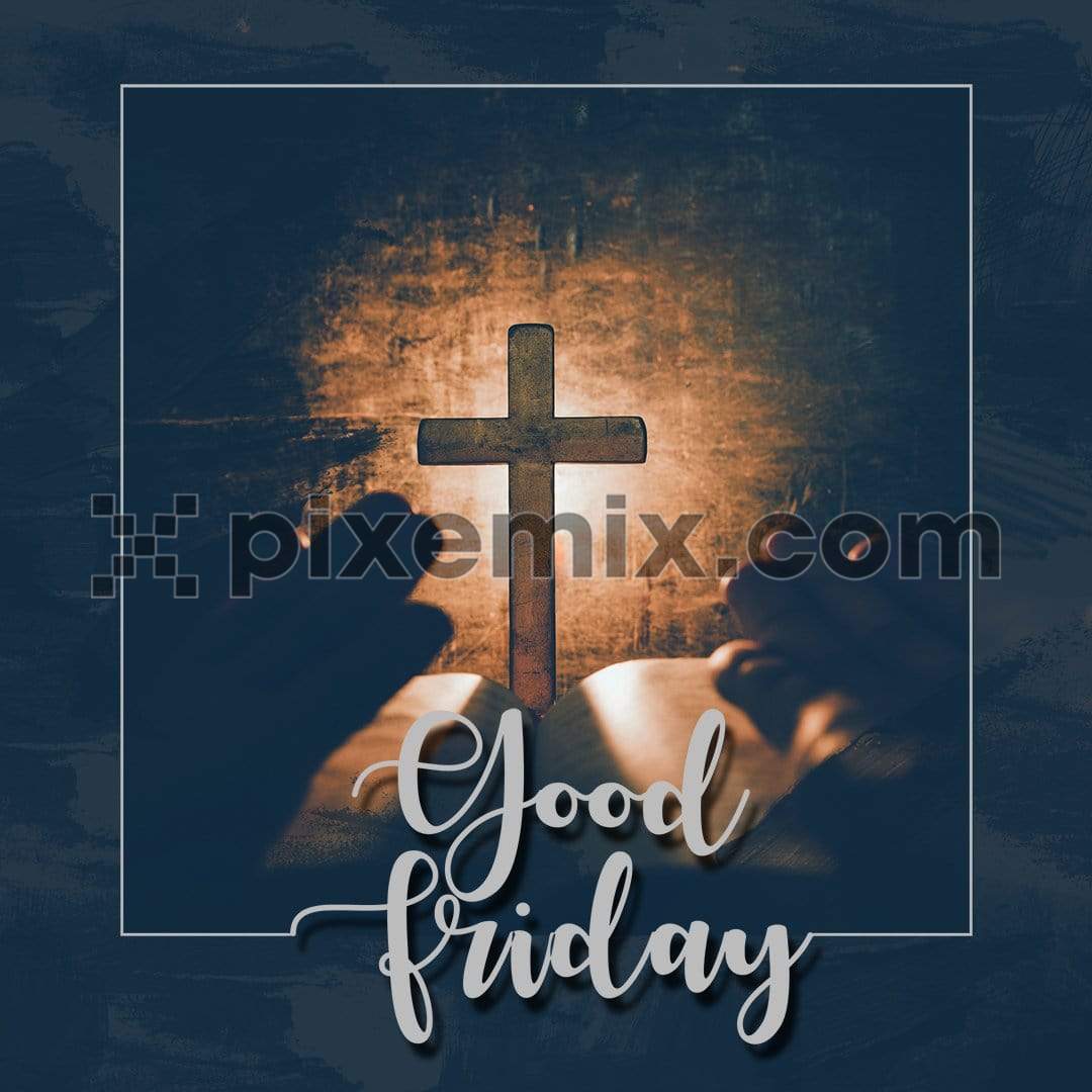 Cross Sign Symbol, open holy bible and pray hands in the worship room with typo social media static post