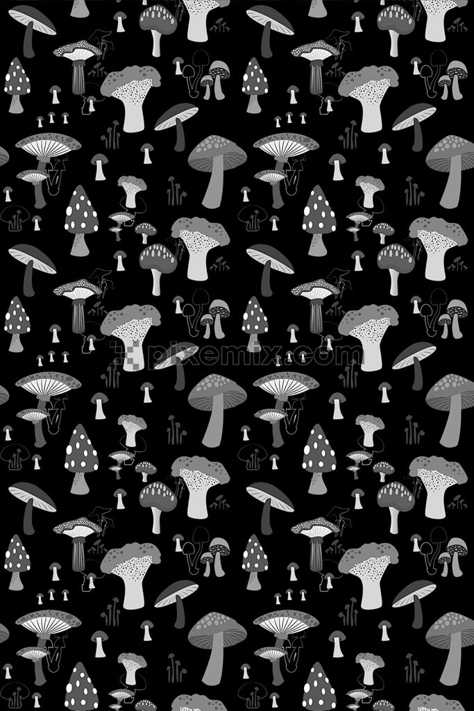 Grey & black mushroom product graphic with seamless repeat pattern