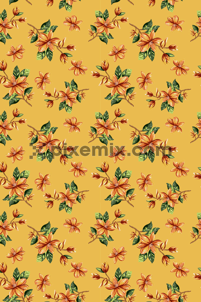 Seamless yellow background with watercolor-style orange flowers and lush green leaves pattern design.