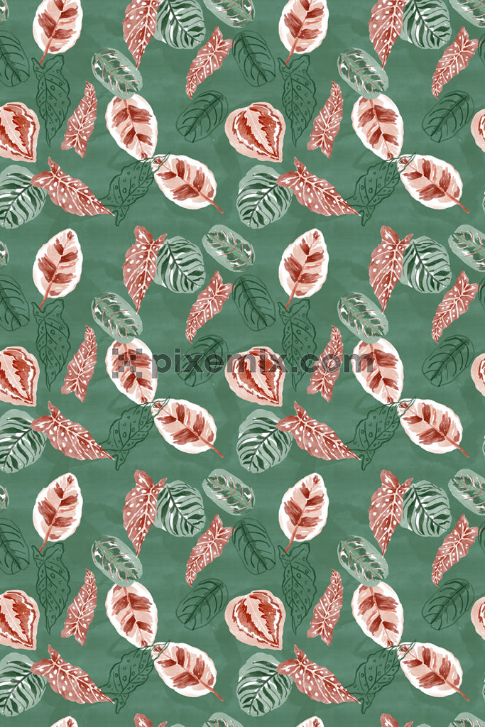 Seamless tropical leaf pattern with hand-painted watercolor foliage in earthy brown, green, and cream tones on a rich green background.